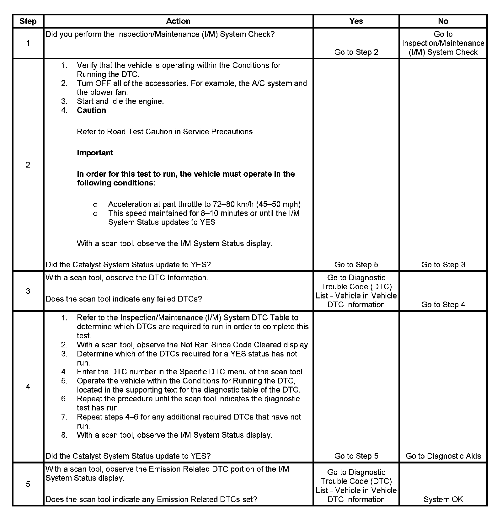 The purpose of this test is to satisfy the enable criteria necessary to execute I/M readiness diagnostics for the catalyst system. The test may be used to set the I/M System Status indicators to YES. Ensure the vehicle meets the requirements listed in Conditions for Running before performing this test. Failure to meet the necessary requirements may produce inaccurate test results.