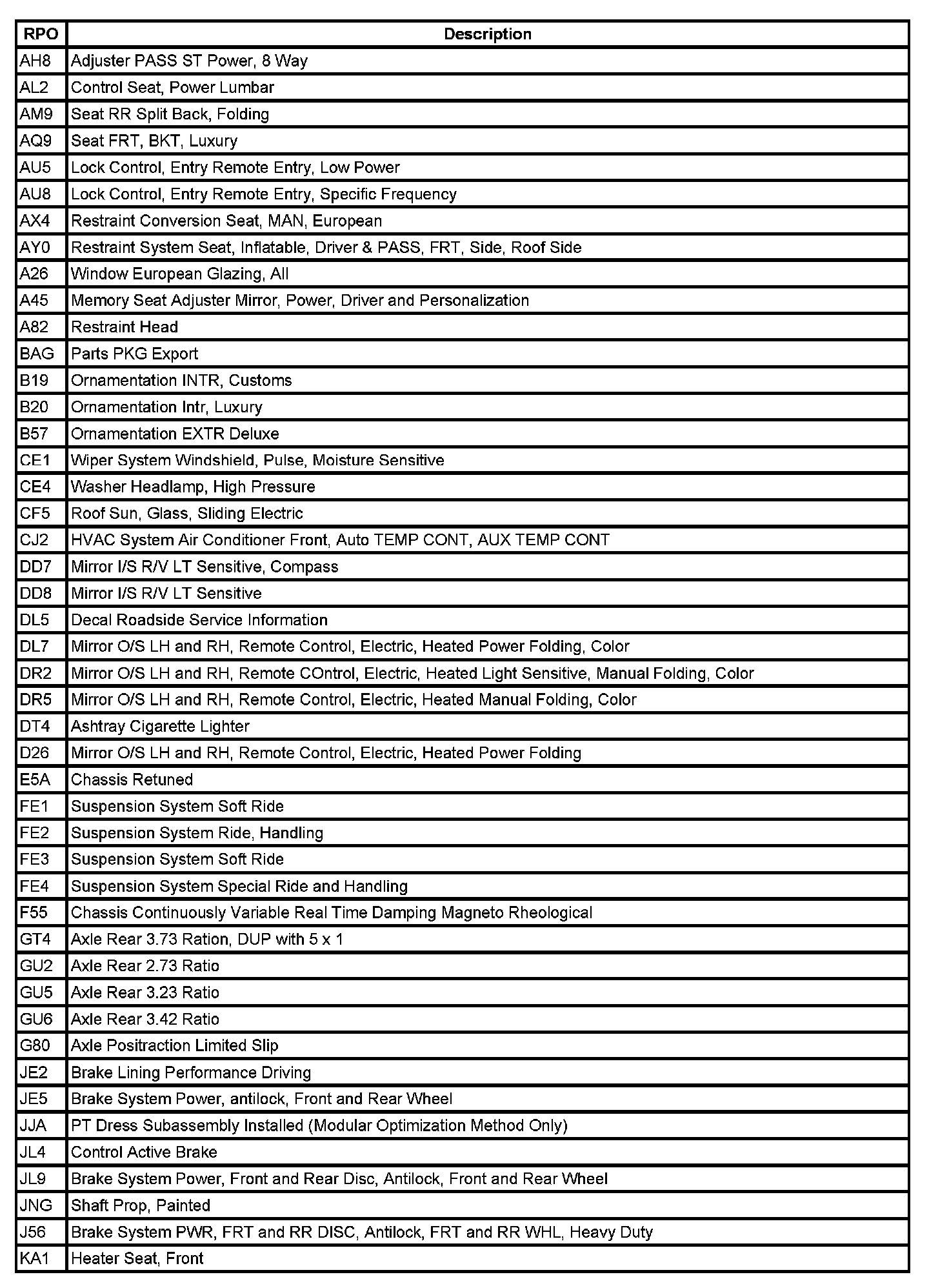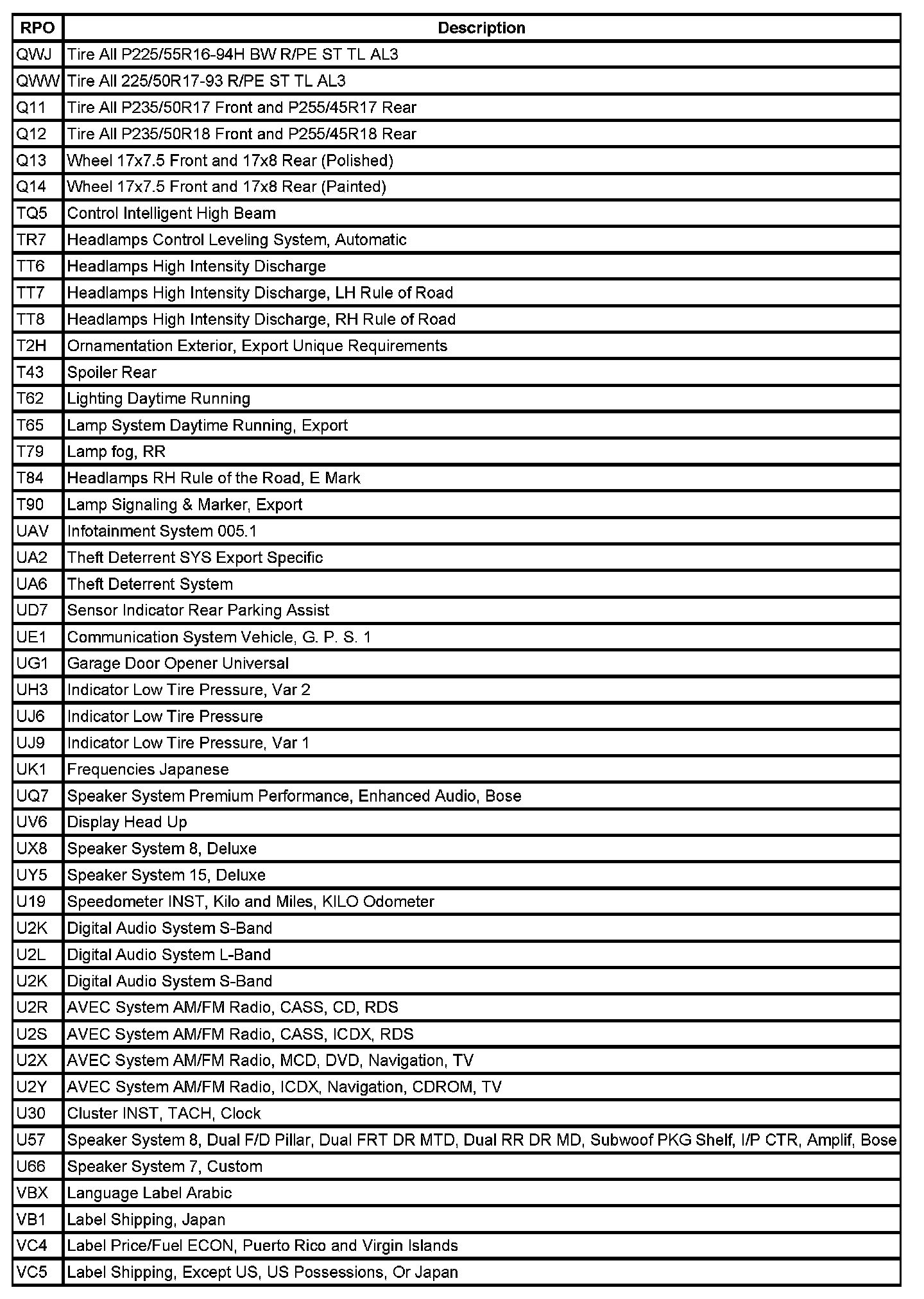 The table provides the description of the Regular Production Option (RPO) codes that are available on the vehicle. The vehicle's RPO list is printed on the Service Parts Identification Label.