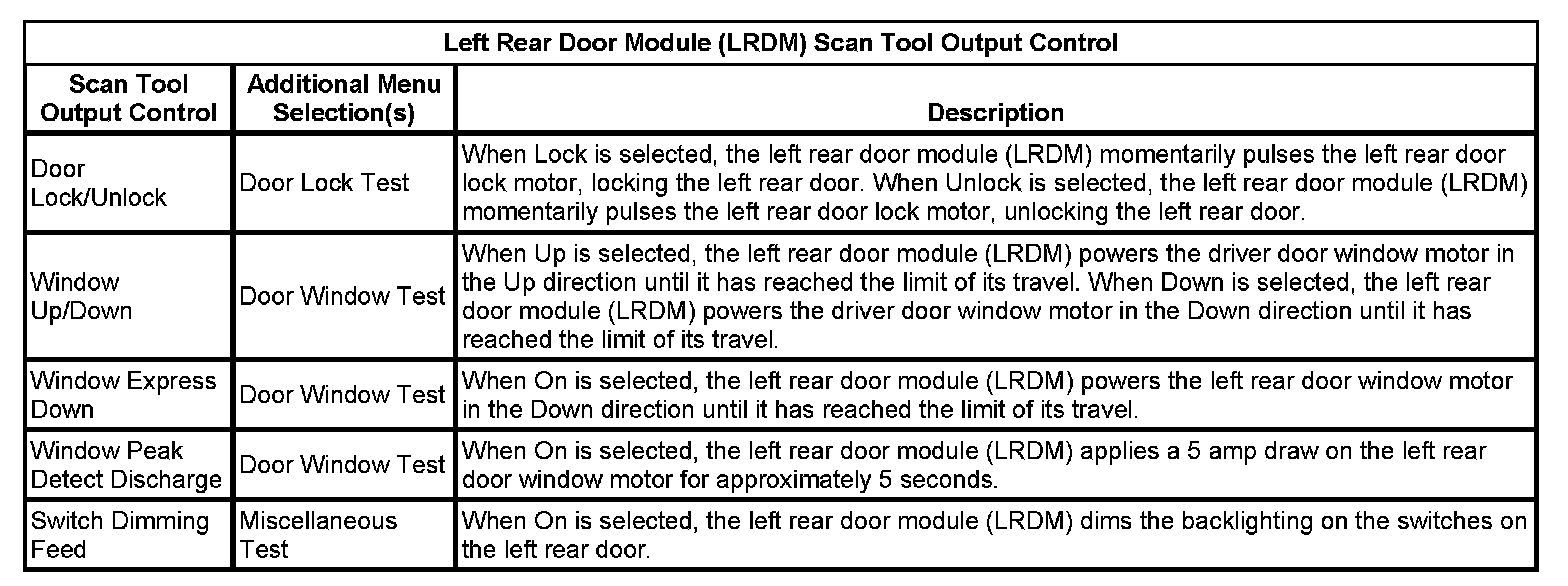 Left Rear Door Module (LRDM) Scan Tool Output Control: