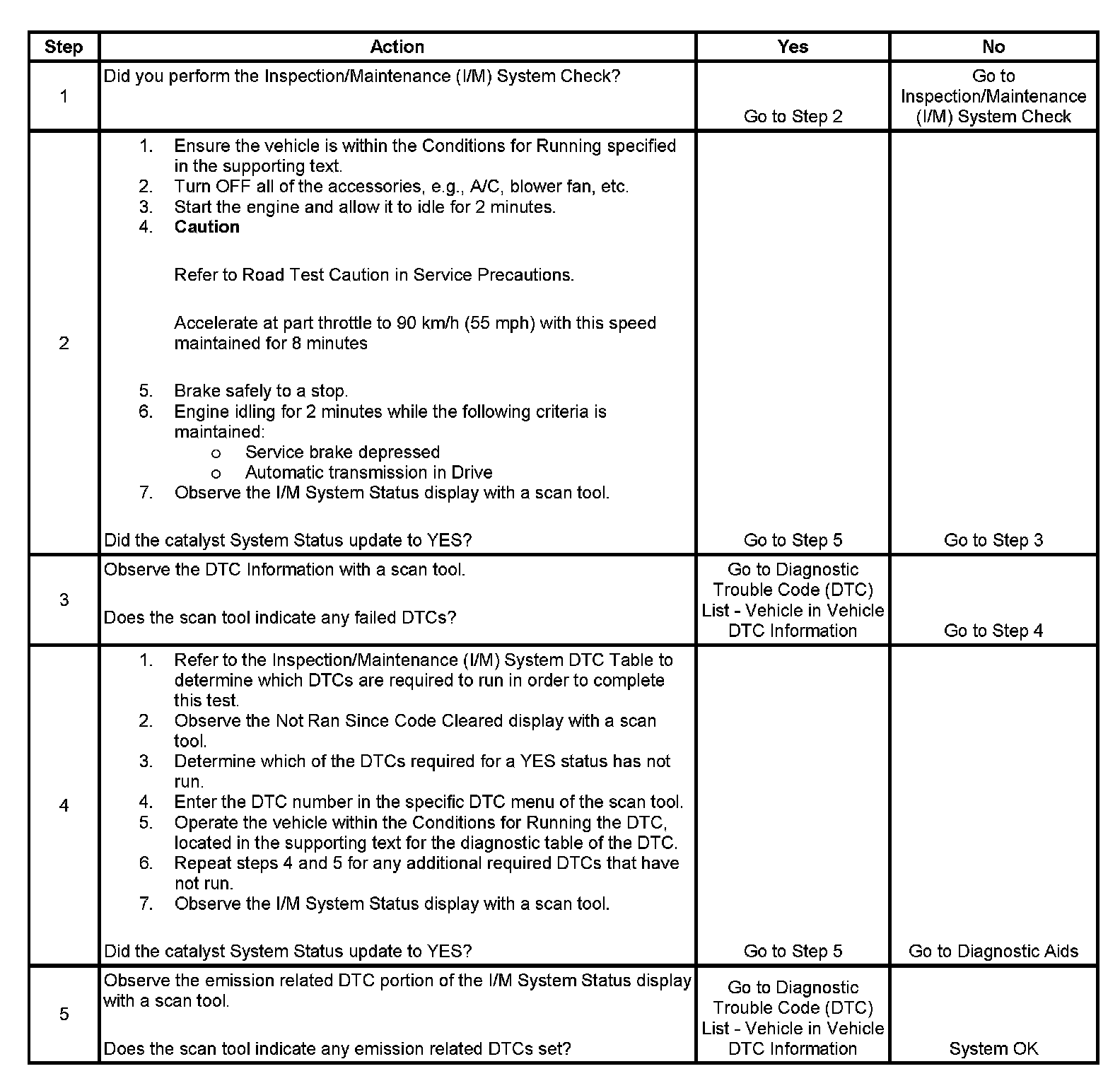 The purpose of this test is to satisfy the enable criteria necessary to execute inspection/maintenance (I/M) readiness diagnostics for the catalyst system. The test may be used to set the I/M System Status indicators to YES. The I/M System Status display on the scan tool provides an indication of whether the control module has completed the required tests. The I/M System Status does not indicate that the tests have passed or failed. When all of the diagnostics for a specific system have run and passed, the I/M System Status will update to YES. If a test for a specific system has failed, the I/M System Status will update to YES, indicating a determination was made even if all of the other tests for that system have not run.