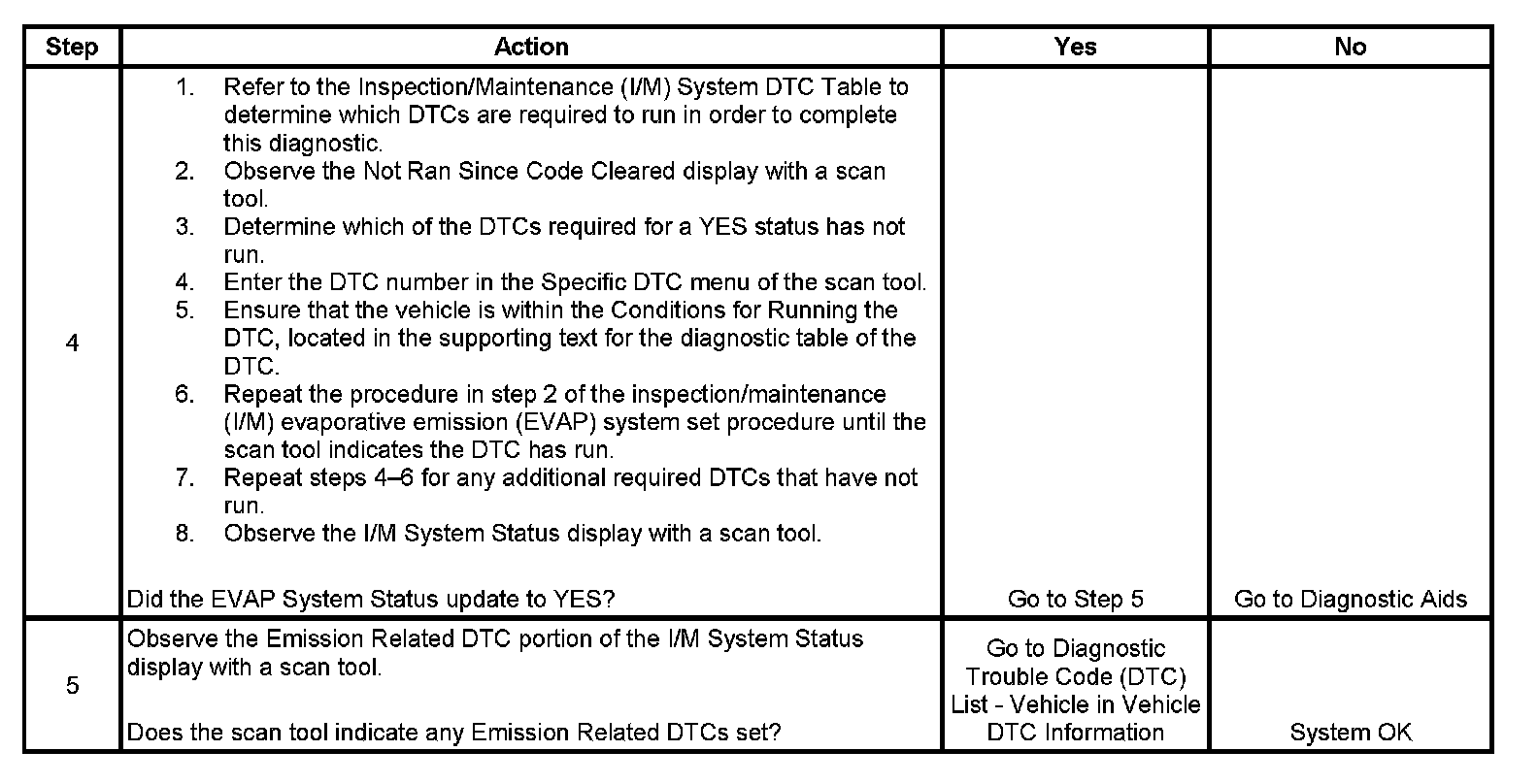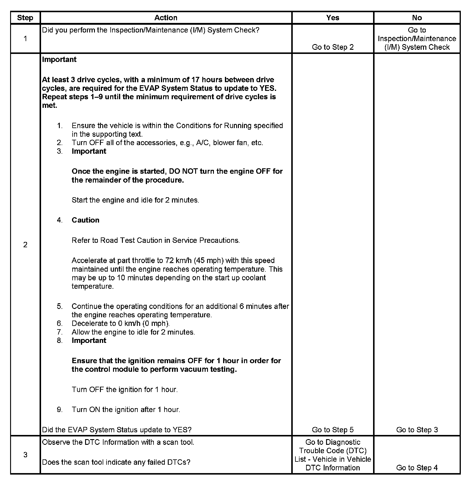 The purpose of this procedure is to satisfy the enable criteria necessary to execute inspection/maintenance (I/M) readiness diagnostics for the Evaporative Emission (EVAP) System. The procedure may be used to set the EVAP I/M System Status display on the scan tool to YES. The EVAP I/M System Status display indicates whether or not the control module has completed the readiness diagnostics. The readiness diagnostics complete when all DTCs comprising the diagnostics run and pass, or any DTC comprising the diagnostics illuminates the malfunction indicator lamp (MIL). If the diagnostics pass during one drive cycle, seventeen hours must elapse, regardless of whether the vehicle is driven or not. Then, the diagnostics will run again during the next drive cycle in which the conditions for running are met. Once the diagnostics have passed during the third drive cycle, the EVAP I/M System Status display will be updated to YES. A failed or aborted diagnostic will require the vehicle to cool down in order to meet the enable criteria for another drive cycle. Therefore, performing a visual inspection prior to running the EVAP test may prevent having to repeat the drive cycle.