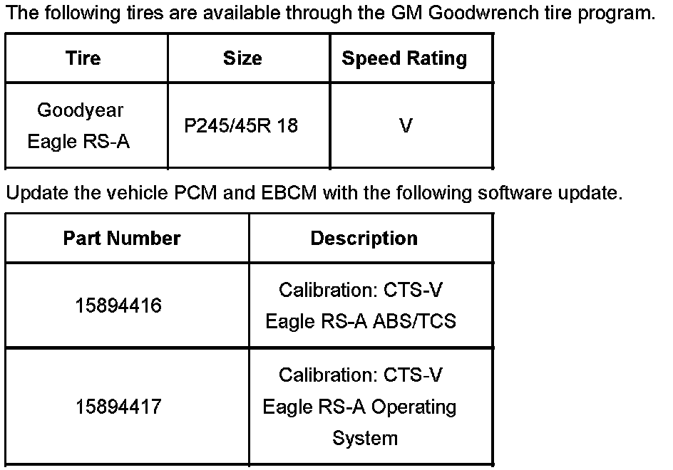 For customers that value increased tire tread life, increased all-season traction, and a softer/quieter ride, GM has identified a suitable replacement tire that achieves these goals while retaining the run-flat ability of the original equipment tires. The Goodyear Eagle RS-A P245/45R18 EMT is a V-speed rated High Performance All-Season Runflat tire. When switching from the original tires to the Eagle RS-A (or other possible manufacturers) All-Season tires, it is necessary to revise the EBCM and PCM software calibrations. The revised calibrations will tailor vehicle powertrain and control systems to the All-Season design tire. The suggested Eagle RS-A is a V-speed rated High Performance All-Season tire that when combined with updated vehicle calibrations may achieve speeds of up to 239 km/h (149 mph).