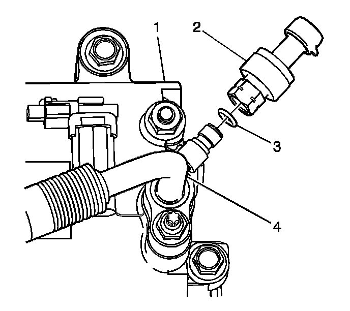 4. Remove the A/C refrigerant pressure sensor (2) from the suction hose (4).