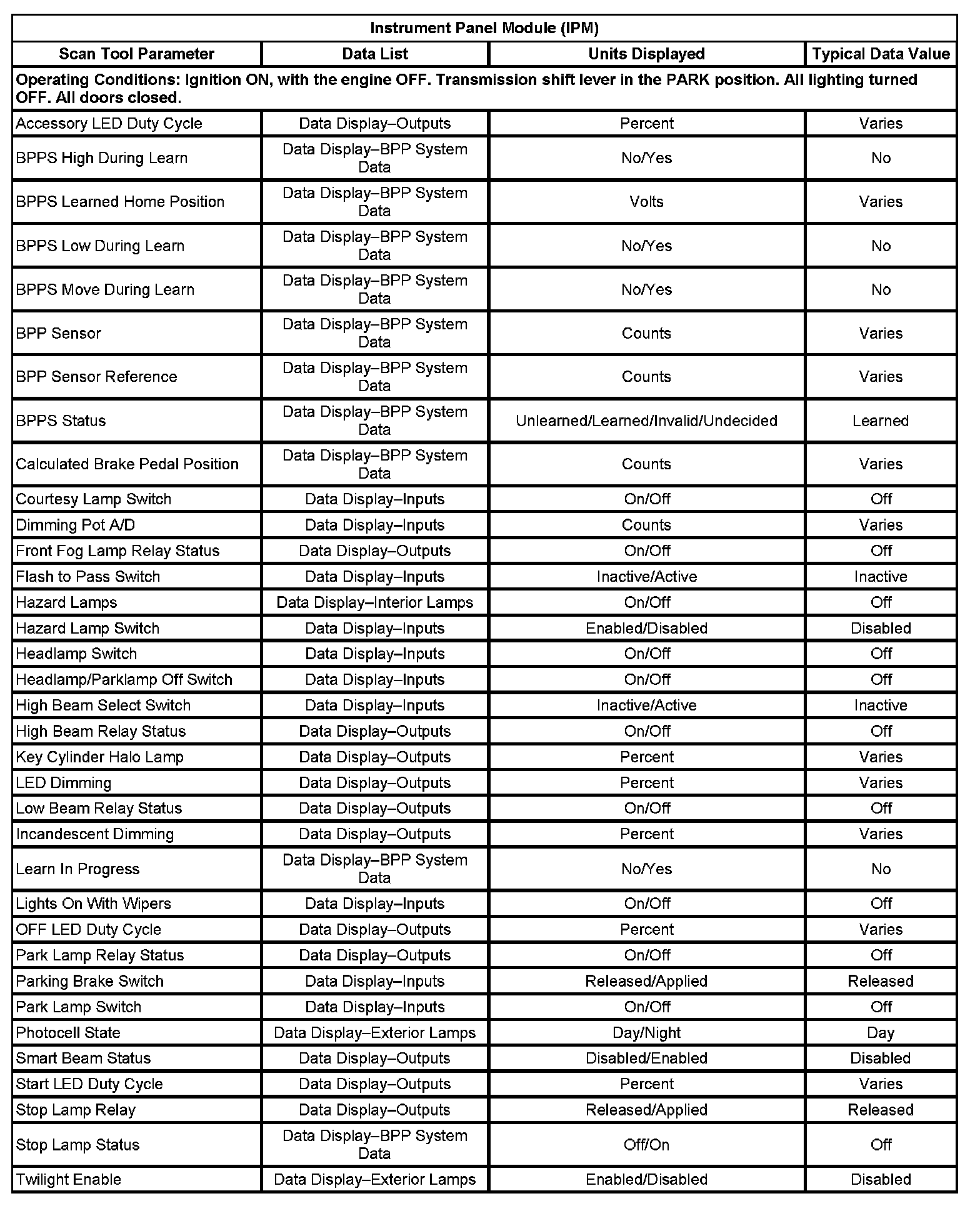 Scan Tool Data List - Instrument Panel Module (IPM)