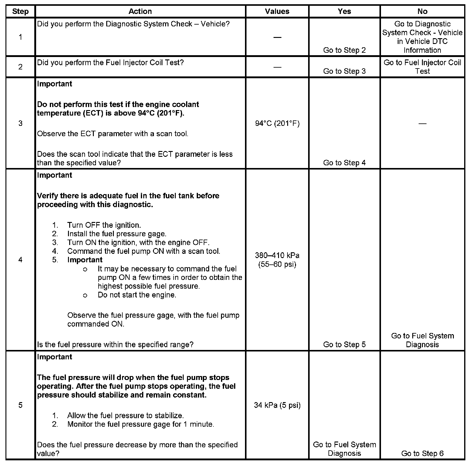 5. This step tests for an internal fuel leak. If the fuel pressure drops during this test, then an internal loss of pressure is indicated. The fuel pressure should reach a steady value.