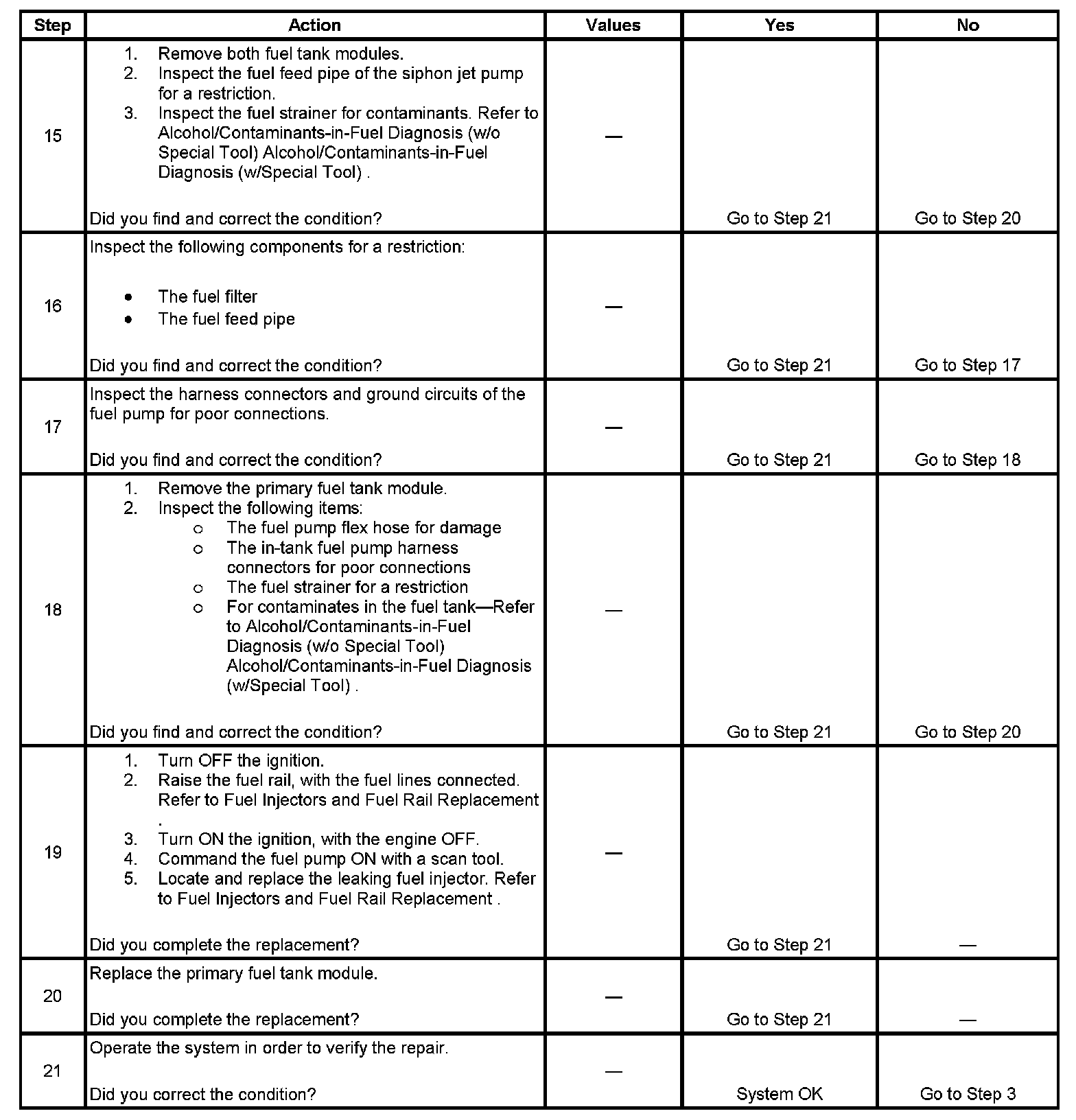 17. This step verifies that a circuit condition is not the cause of a fuel pressure concern. Inspect all fuel pump electrical circuits thoroughly.