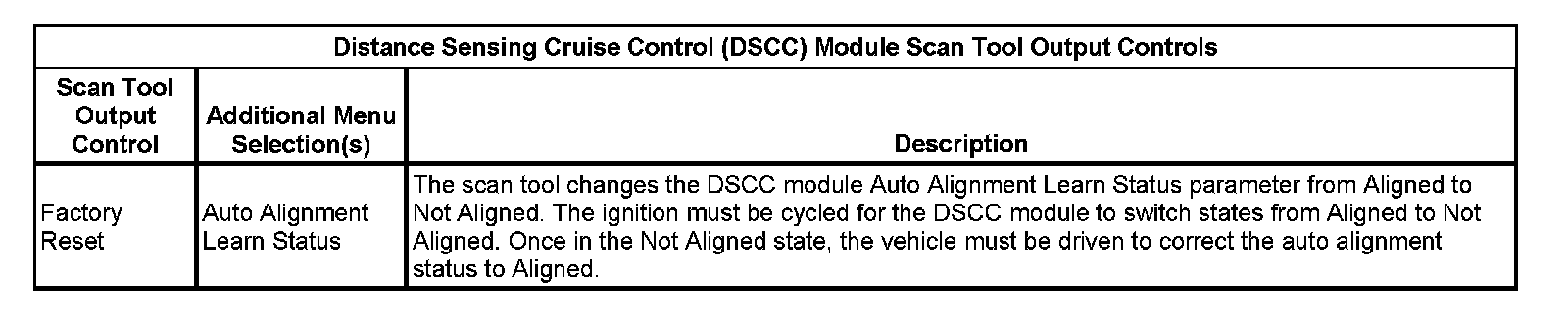 Distance Sensing Cruise Control (DSCC) Module Scan Tool Output Controls: