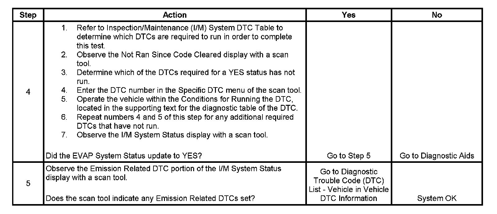 The purpose of this test is to satisfy the enable criteria necessary to execute the inspection/maintenance (I/M) readiness diagnostics for the Evaporative Emission (EVAP) System. The test may be used in order to set the I/M System Status indicators to YES. The I/M System Status Display on the scan tool provides an indication of when the control module has completed the required tests. The I/M System Status does not indicate that the tests have passed or failed. When all of the diagnostics for a specific system have run and passed the I/M System Status will update to YES. If a test for a specific system has failed, the I/M System Status will update to YES, indicating a determination was made, even if all of the other tests for that system have not run. If a small leak is detected, a minimum of 3 drive cycles may be required before the I/M System Status will update to YES. Performing a visual inspection prior to running the EVAP test may prevent having to repeat the test. A failed or aborted test will require the vehicle to cool down in order to meet the enable criteria to run another test.