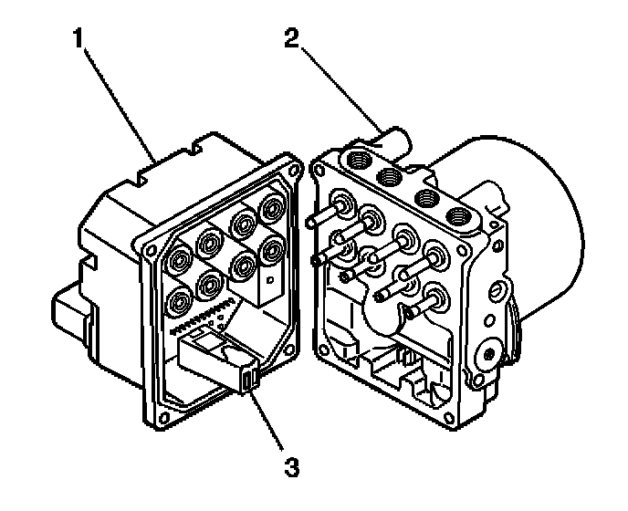 9. Depress the lock tab and release the cam (2) to disconnect the electrical connector from the EBCM (3).