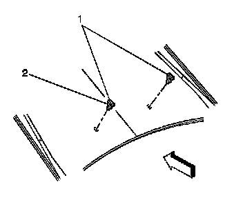 1. Install the washer nozzle (1) to the hood by indexing the tension clips (2) on the nozzle to the opening in the hood.