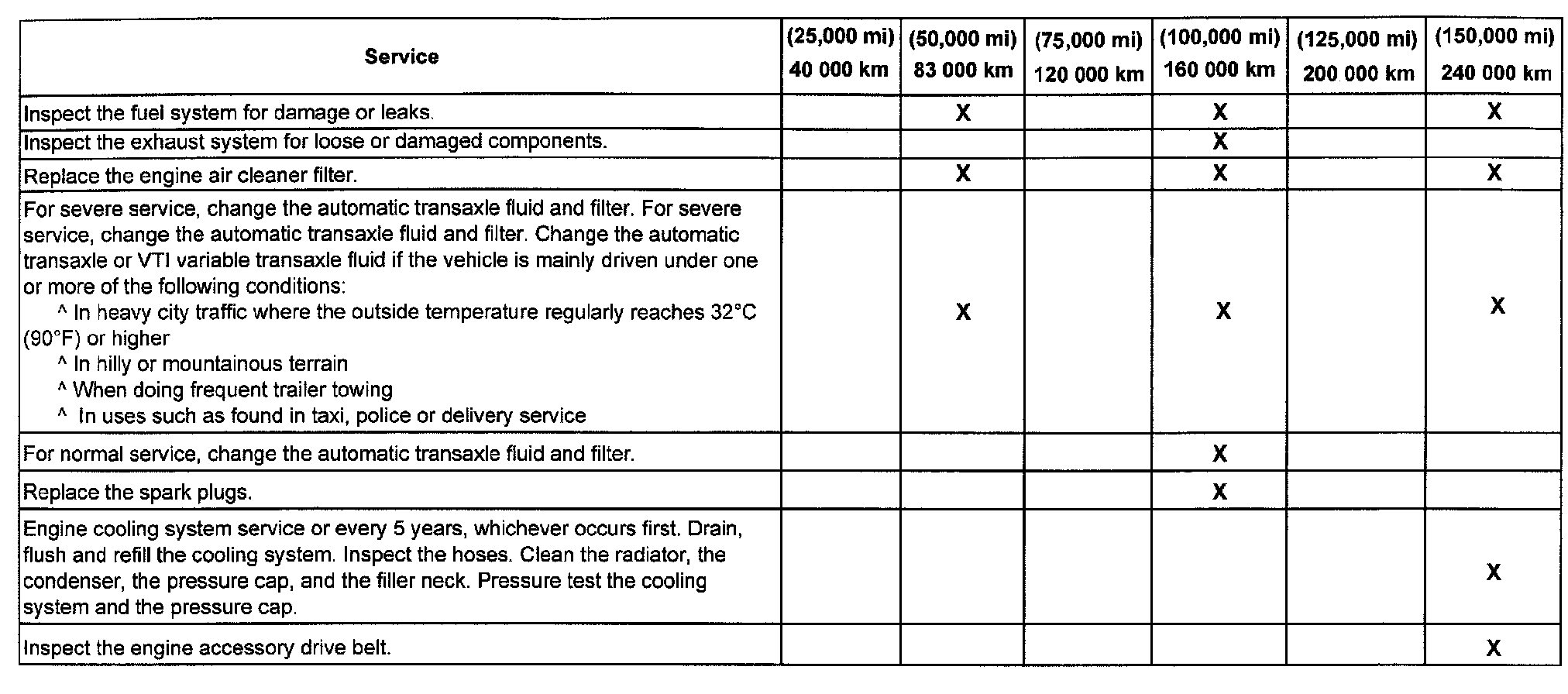 (Maintenance I or Maintenance II) after the indicated kilometers (miles) shown for each item.