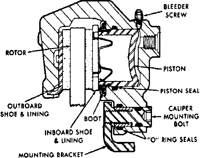 The caliper assembly slides on a mounting sleeve which is secured by a mounting bolt. Upon brake application fluid pressure against the piston forces the inboard shoe against the inboard side of the rotor. This action causes the caliper to slide until the outboard shoe comes in contact with the rotor.