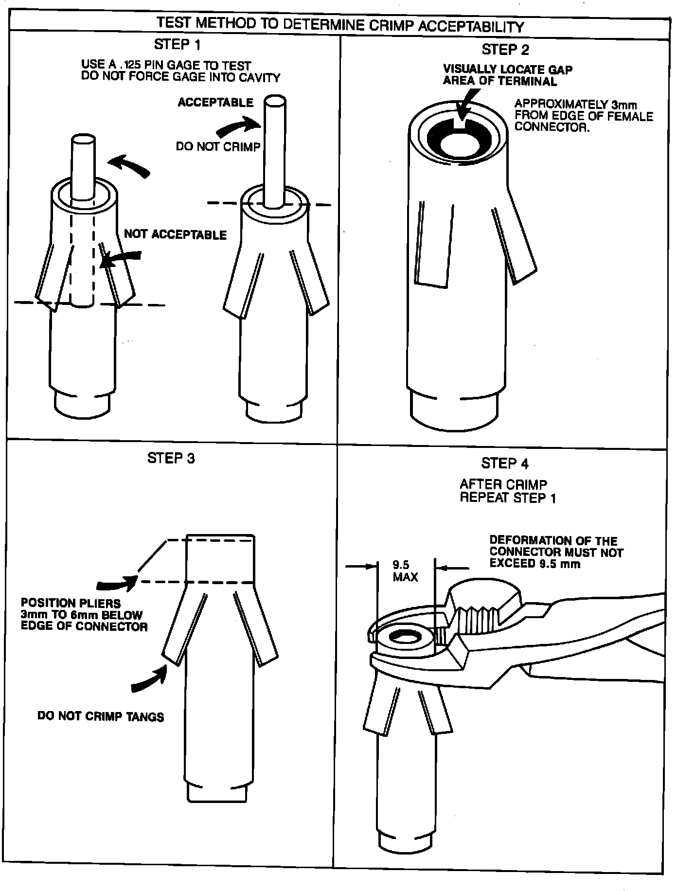 The illustration contains a four-step procedure to test and repair the female terminal. The opening in the female terminal should range from .120" to .125" in diameter. If the gage passes through freely, the terminal should be repaired as illustrated. Gage sets are available from Kent Moore, tool number J26900-14.