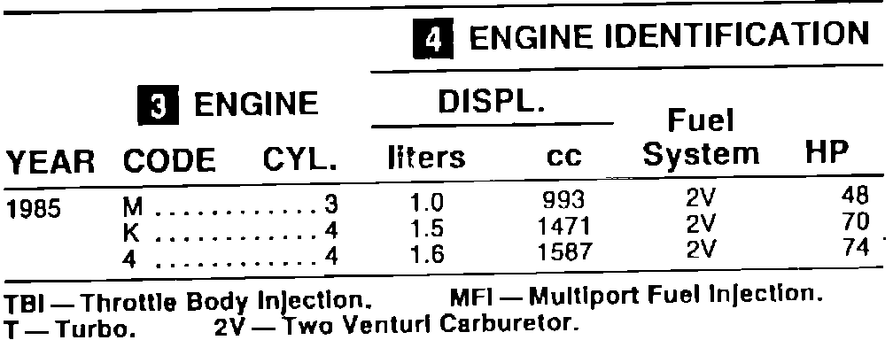 To identify any engine by the manufacturer's code, follow the four steps designated by the numbered blocks.MODEL YEAR IDENTIFICATION:
