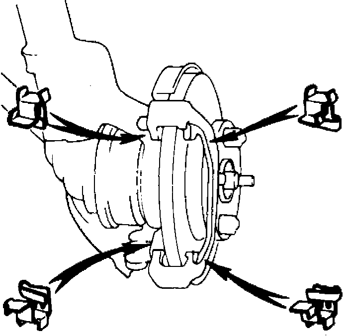 1. Remove caliper as outlined, leaving brake hose connected, and secure caliper aside.
