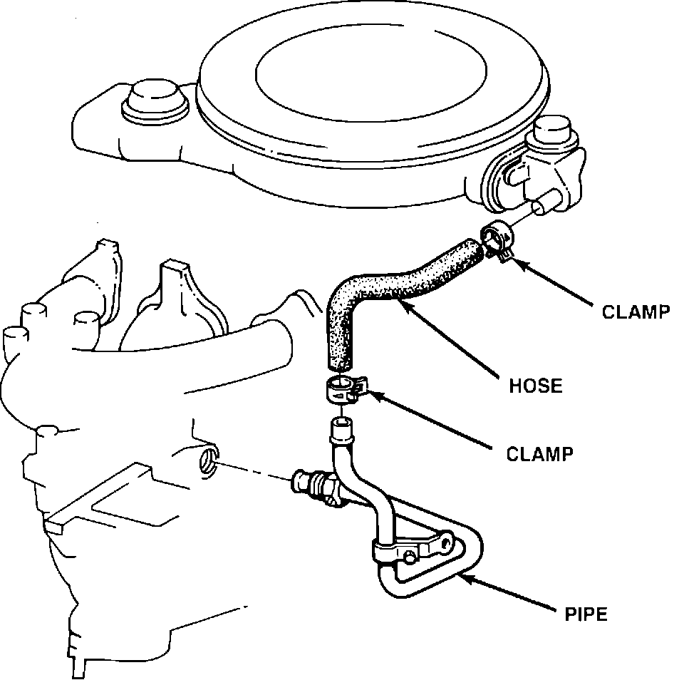 7. Remove AIR suction pipes and hoses, unfasten pipe union at exhaust manifold side and unfasten pipe clamp. Install plug (part of kit) into exhaust manifold AIR suction pipe hole.