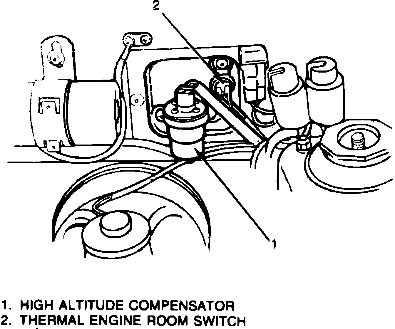 The ECM monitors barometric pressure and ambient air temperature through switches mounted in the engine compartment, Fig. 6. The high altitude compensator (barometric pressure switch) and ambient temperature switch allow the ECM to adjust air/fuel mixtures based on vehicle operating conditions. The ECM provides richer mixtures for low altitude and/or low temperature operation, and leaner mixtures for high temperature and/or high altitude operation.