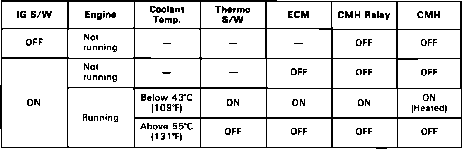 The Cold Mixture Heater (CMH) system, Fig. 5, uses a heating element to warm the intake manifold during cold engine operation. The ECM monitors alternator output to determine if the engine is running and coolant temperature in order to control voltage applied to the heating element. When the engine is running and coolant temperature is below 109° F, the ECM activates the CMH relay which in turn energizes the heating element. When coolant temperature exceeds 109° F, or if no alternator output signal is sensed by the ECM, the CMH relay is deactivated and no current is applied to the heating element.