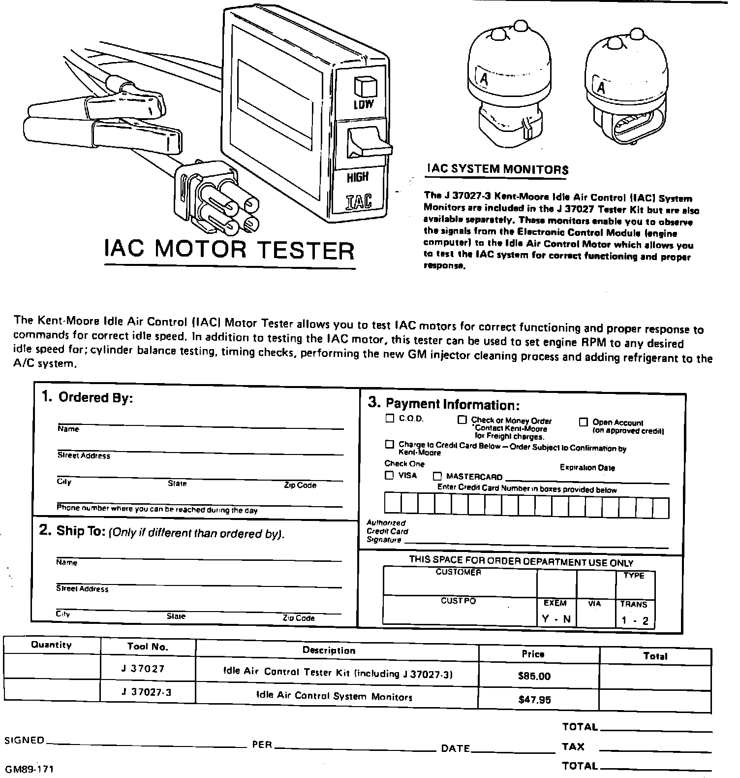 The use of the tester kit and improved diagnostics represent a superior IAC testing procedure that will result in a high degree of user confidence. The tester positively concludes that the IAC system is either fully functional or faulty and if faulty whether it is the valve or the circuits. The tester kits can be ordered from Concept Technology, Inc. or Kent-Moore, Inc. Order forms are included with this bulletin.