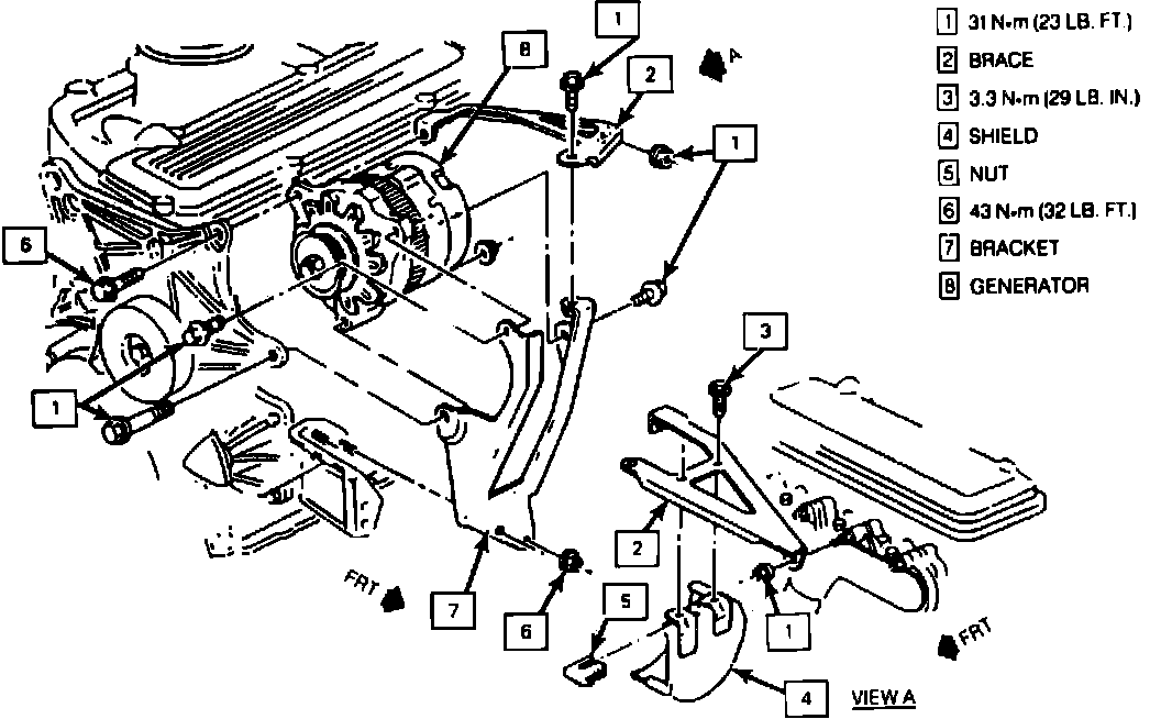 10. Disconnect alternator electrical connector, then remove the top brace, Fig. 3.