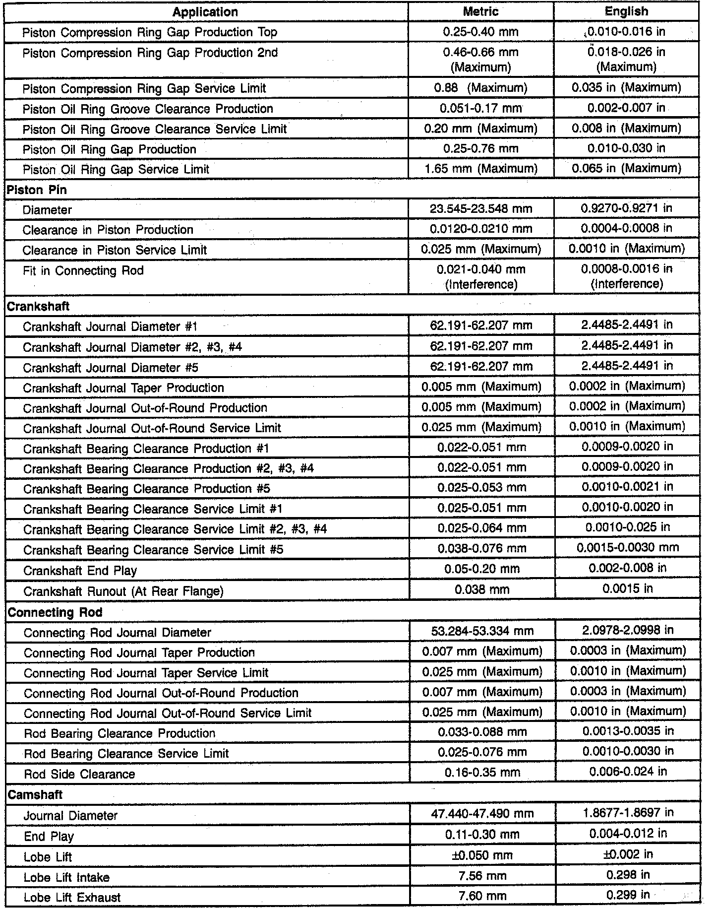 Piston Rings, Piston Pin, Crankshaft, Connecting Rod, Camshaft: