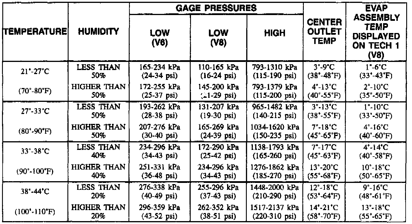 Performance testing provides a measure of air conditioning system operating efficiency by measuring and comparing pressures at the high-pressure and low-pressure sides of the refrigeration system, the temperature of the air being discharged into the passenger compartment, and the evaporator temperature.