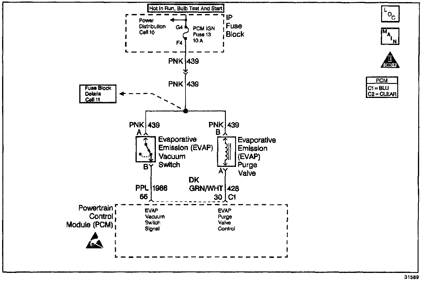 The EVAP purge vacuum switch is a normally closed switch positioned in the purge line between the canister and the EVAP purge solenoid. The EVAP purge vacuum switch will open when vacuum increases to greater than 5 inches of water in the purge line. The PCM monitors the EVAP purge vacuum switch signal to determine of the evaporative emission control system is working properly. If the switch is closed (no purge flow) when the PCM is commanding the EVAP purge solenoid ON, DTC P0441 should be set. If the switch is open (purge flow detected) when the PCM is not commanding the EVAP purge solenoid ON, DTC P1441 should be set. If the switch is open when sufficient vacuum should not be present, DTC P1442 should be set.