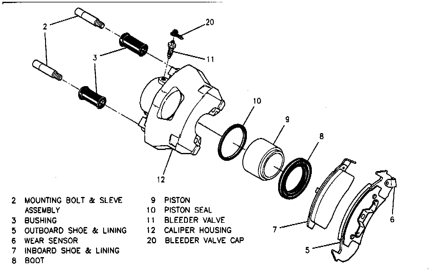 7. Caliper from rotor and knuckle. Do not let caliper hang from brake hose. Damage may occur. If the caliper assembly is not being removed from the vehicle for unit repair, suspend the caliper with a wire hook from the strut. Inspect mounting bolts and sleeve assemblies for corrosion. Bushings for cuts or nicks. If damage to either part is found, replace with new parts when installing caliper. Do not attempt to polish away corrosion.