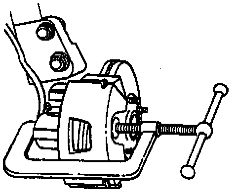 4. Push piston into caliper bore to provide clearance between linings and rotor. Install a large C-clamp over the top of the caliper housing and against the back of the outboard shoe. Slowly tighten C-clamp until piston is pushed into the caliper bore enough to slide the caliper assembly off rotor.
