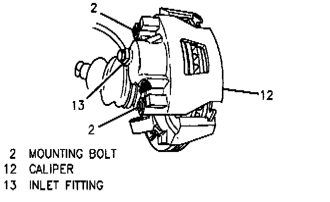 5. Bolt attaching inlet fitting only when caliper is to be removed from vehicle for unit repair (overhaul). If only shoe and linings are being replaced, there is no need to disconnect inlet fitting. Plug exposed inlet fitting in caliper housing and brake hose to prevent fluid loss and contamination.