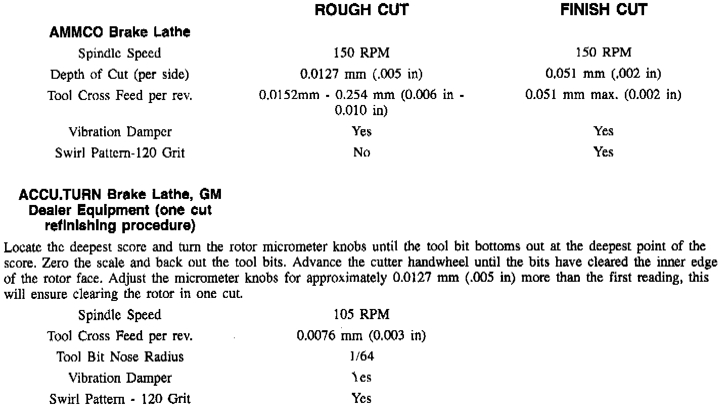 Refer to chart showing two recommended procedures that achieve adequate results using two different vendor's off-vehicle drum/disc brake lathes (If any other vendor's lathe is used, follow that vendor's recommended procedure). It is very important that the rotor surface be made non-directional by dressing the rotor surfaces with a sanding disc power tool such as Ammco 8350 Safe Swirl Disc Rotor Grinder, or equivalent, using 120 grit aluminum oxide sandpaper. Sand each rotor surface with moderate pressure for a minimum of 60 seconds. An alternate method is to use a sanding block with 150 grit aluminum oxide sandpaper. With the rotor turning approximately 150 RPM, sand each rotor finish for a minimum of 60 seconds using moderate pressure. After the rotor has been sanded, clean each surface with denatured alcohol or suitable brake cleaner. The finish rotor surface should be as close to that of a new rotor as possible. Failure to obtain the best possible rotor finish may affect initial braking performance.