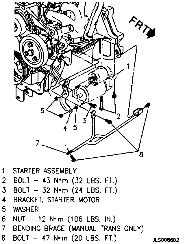 - Install nuts/bolts that hold the starter bracket to the starter and engine to 43 N.m (32 lb. ft.).