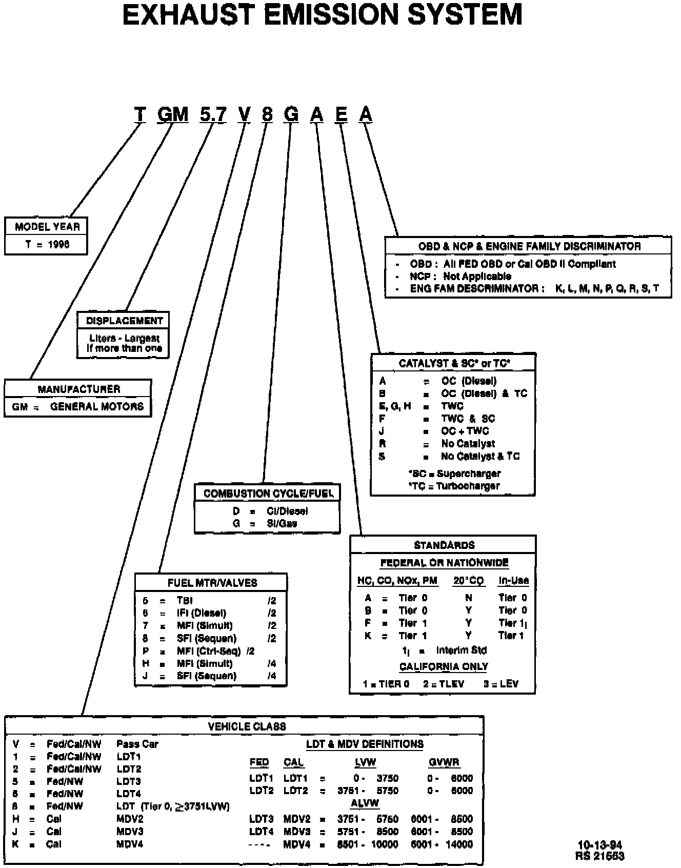 The underhood "Vehicle Emissions Control Information" label, a sample of which is located in the accompanying image, contains important emission specifications and setting procedures. In the upper left corner is exhaust emission information which identifies the year, the manufacturing division of the engine, the displacement of the engine in liters the class of vehicle, and type of fuel metering. The label also contains an illustrated emission components and vacuum hose schematic.