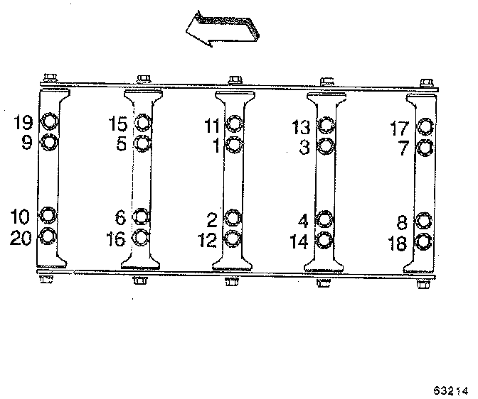 Tighten the bearing cap bolts and studs. Tighten the inner M10 bearing cap bolts first pass in sequence to 20 Nm (15 ft. lbs.).