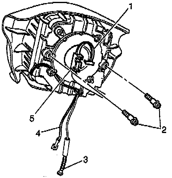 2. Remove the screws retaining (4) the driver inflator module (3) to the steering wheel.