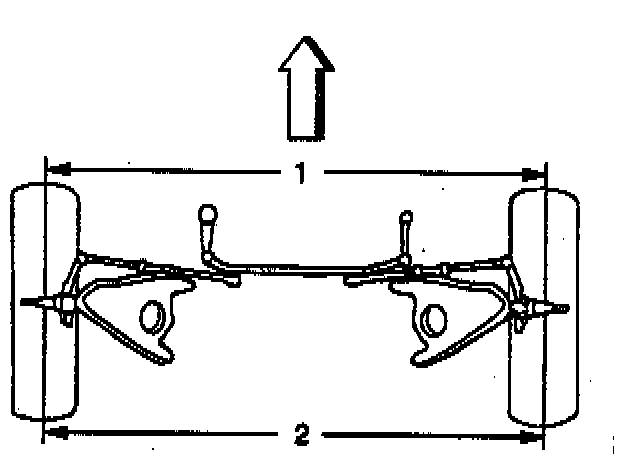 Total toe can also be measured and is the relationship or difference between the front toe dimension (1) and the rear toe dimension (2). Total toe indicates the tire to tire relationship, but does not give any indications as to the tires relationship to the vehicle centerline. Toe also serves to offset the small deflections of the tire and the wheel support system which occur when the vehicle is rolling forward. In other words, even when the tires and the wheels are set to toe in or slightly when the vehicle is standing stilt, they tend to roll parallel on the road when the vehicle is moving. Toe affects tire wear.