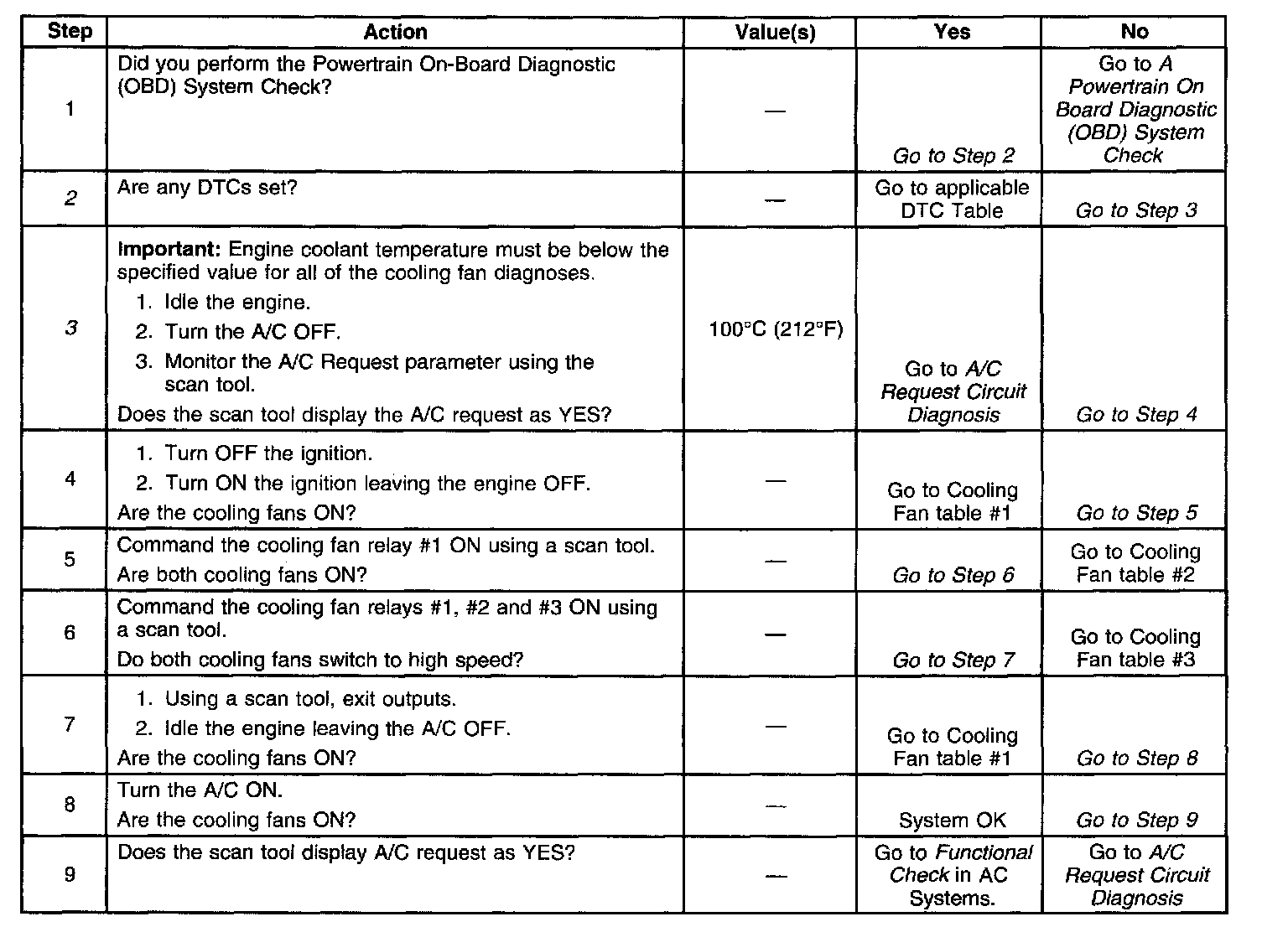 2. The PCM will enable the engine cooling fans when certain Diagnostic Trouble Codes are set. Go to applicable DTC Table first before proceeding with this table.