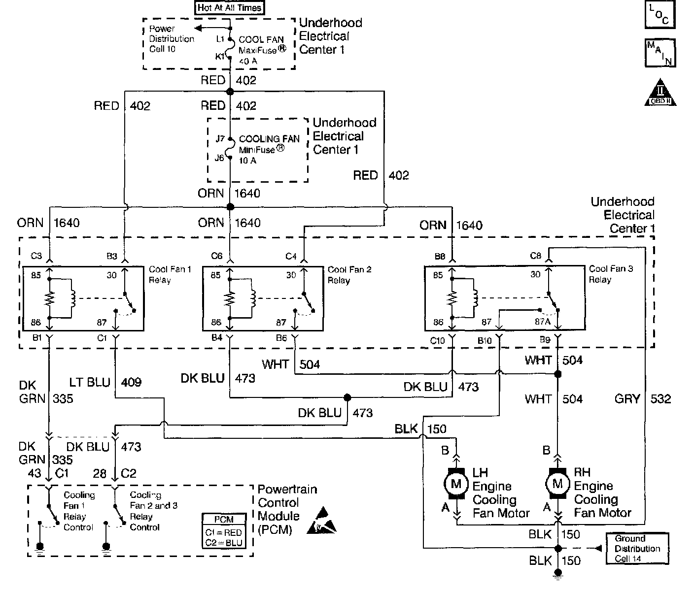 The cooling fans are controlled by the PCM based on various inputs. Ignition voltage is supplied to all three cooling fan relay coils. The PCM controls cooling fan relay # 1 by providing the ground path. The PCM controls cooling fan relays # 2 and # 3 together by providing a ground path. The left and right cooling fans are connected in series. This will enable both fans on low speed when the fan # 1 relay is energized. When all three fan relays are energized, both fans will operate at high speed. The high speed is possible because the fan relays are wired in a parallel circuit. When the PCM detects that certain DTCs are set, the PCM will enable the cooling fans.
