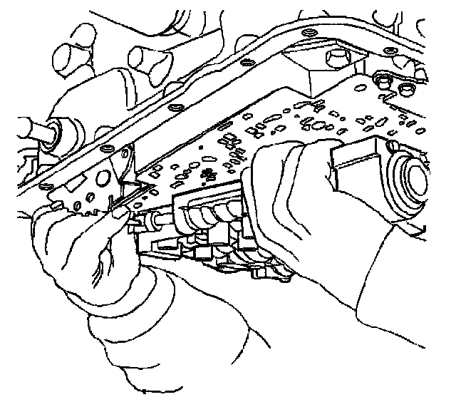 14. Carefully begin to lower the control valve body down from the transmission case, disconnect the manual valve link, then remove the control valve body from the transmission case.