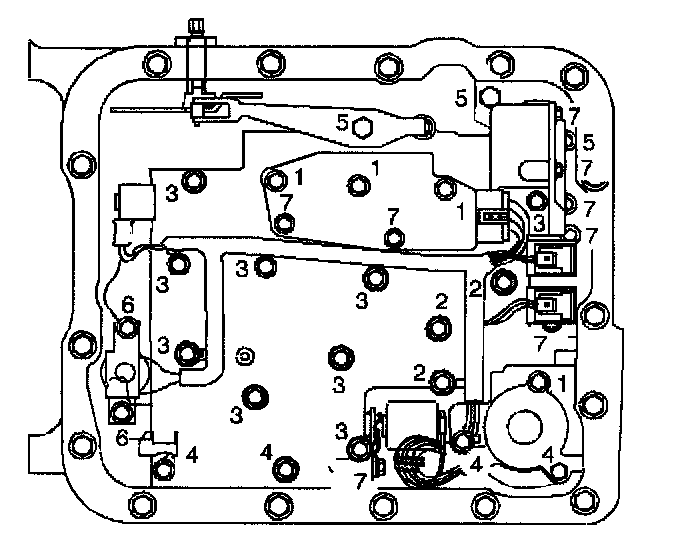 5. Remove the TCC solenoid retaining bolts and the valve body bolts which retain the internal wiring harness.