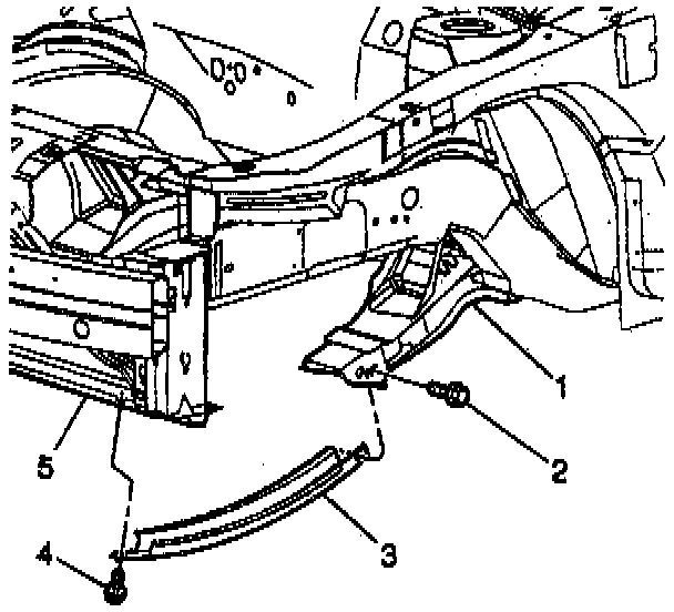 7. Remove the crossmember extension brace (3) bolts (2 and 4) from the lower tie bar (5).