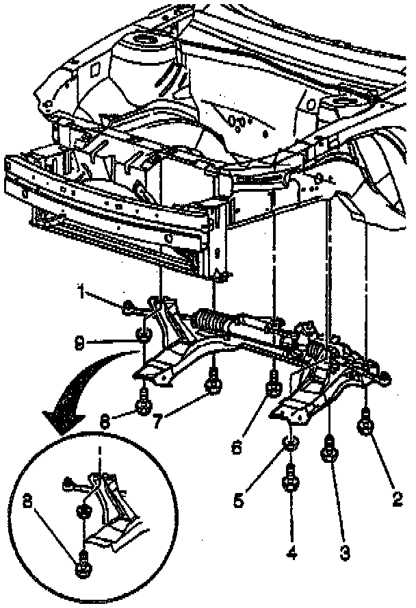 ^ Tighten the crossmember support upper front bolts to 90 Nm (66 ft. lbs.) plus a 90° rotation.