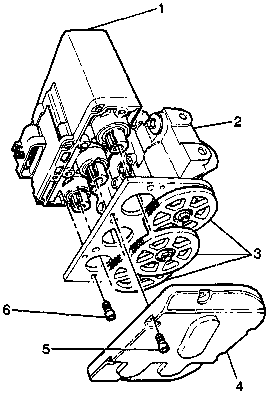 4. Remove the four Torx head screws (6) attaching the motor pack (1) to the brake modulator (2).