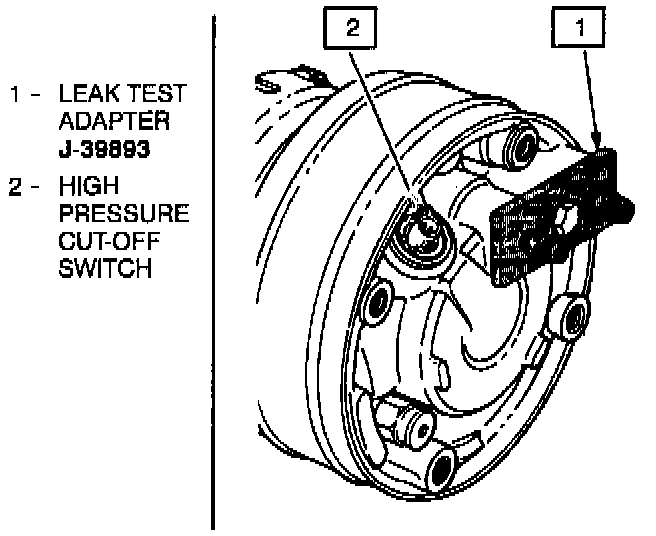 3. Using leak detector J 39400, check for leaks at pressure relief valve, rear head switch location, compressor front and rear head seals, through bolt head gaskets and compressor shaft seal.