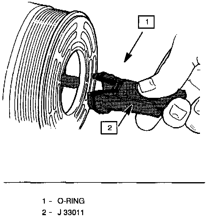 2. Insert the O-ring installer J 33011 into the compressor neck until the installer "bottoms." Lower the moveable slide of the O-ring installer to release the O-ring into the seal O-ring lower groove. (The compressor neck top groove is for the shaft seal retainer ring.) Rotate the installer to seat the O-ring and remove the installer.