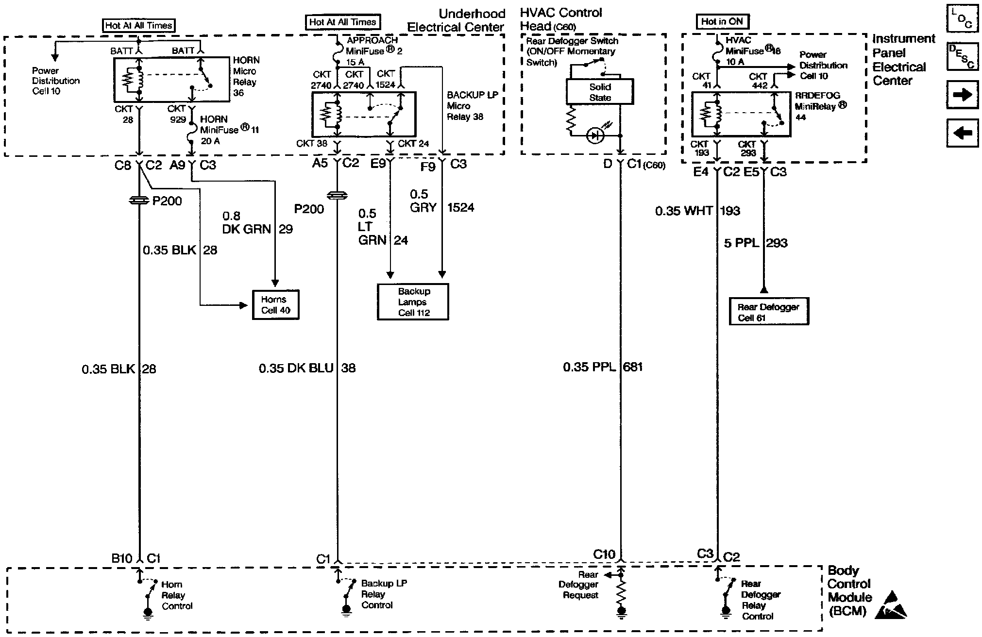 Body Control Module Schematics: Horn, Backup & Rear Defogger System: