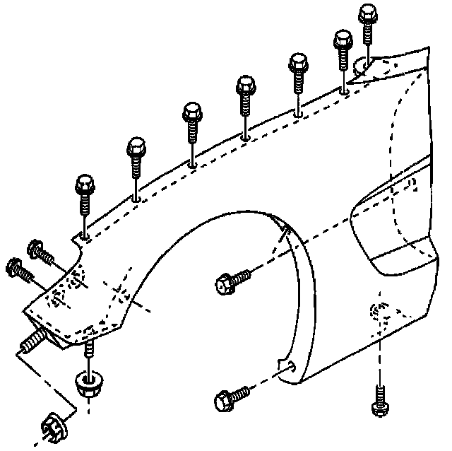 15. Remove the screws attaching the fender to the upper wheelhouse flange.