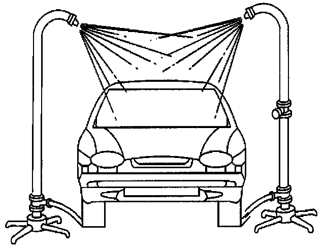 3. When testing the windshield header and front body pillar weatherstrips set the stands so the nozzles point approximately 30 degrees down and 45 degrees toward the rear of the vehicle.