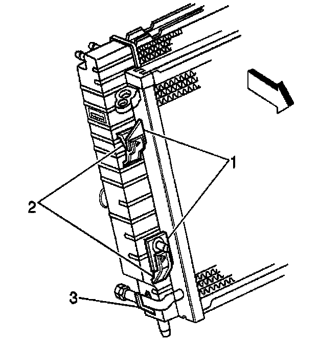 11. Carefully raise the condenser along the radiator Just enough to release the condenser tabs (1) from the radiator slots (2) and the condenser tube from the tube retainer (3).