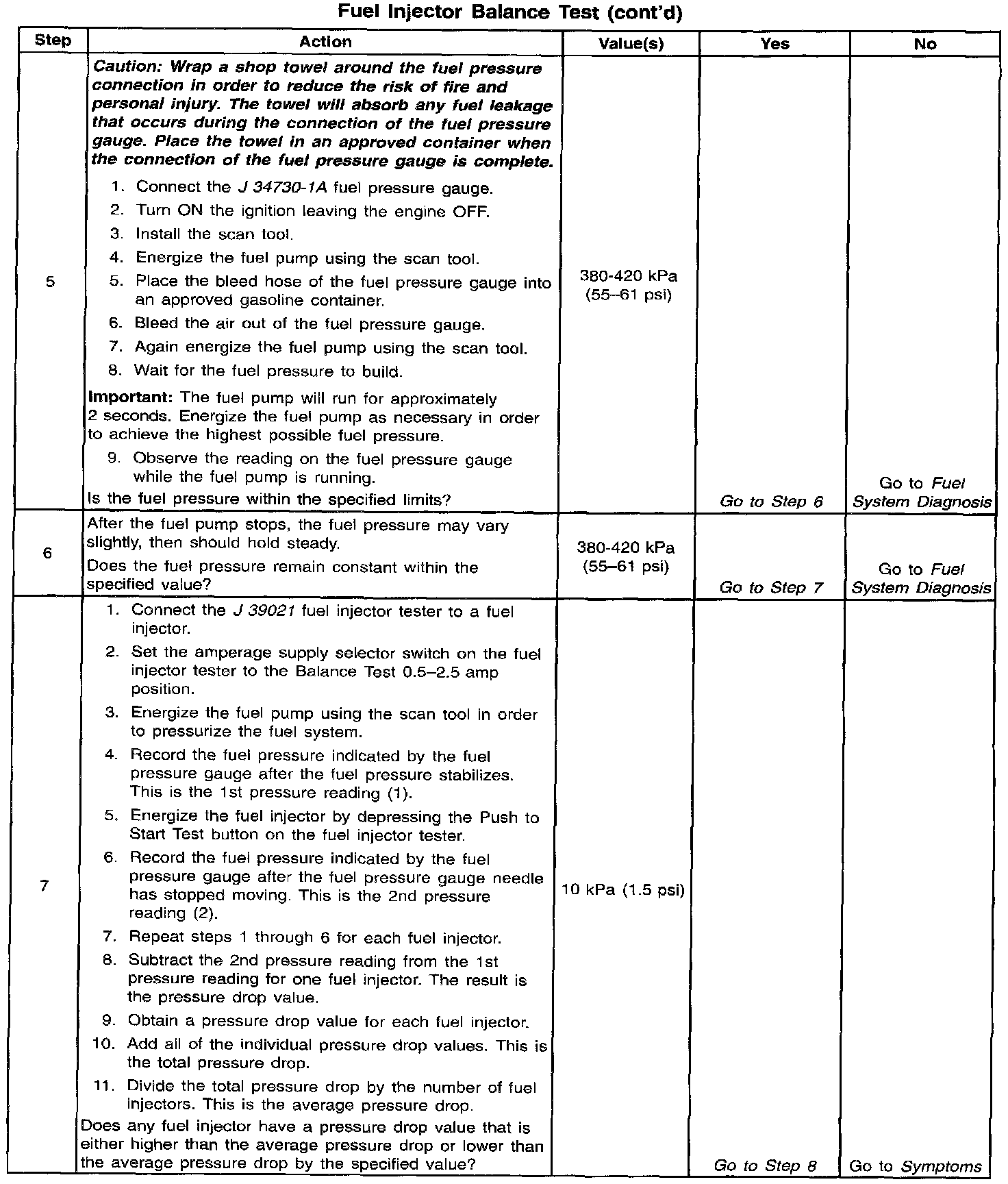 7. If the pressure drop value for each fuel injector is within 10 kpa (1.5 psi) of the average pressure drop value, the fuel injectors are flowing properly. Calculate the pressure drop value for each fuel injector by subtracting the second pressure reading from the first pressure reading.